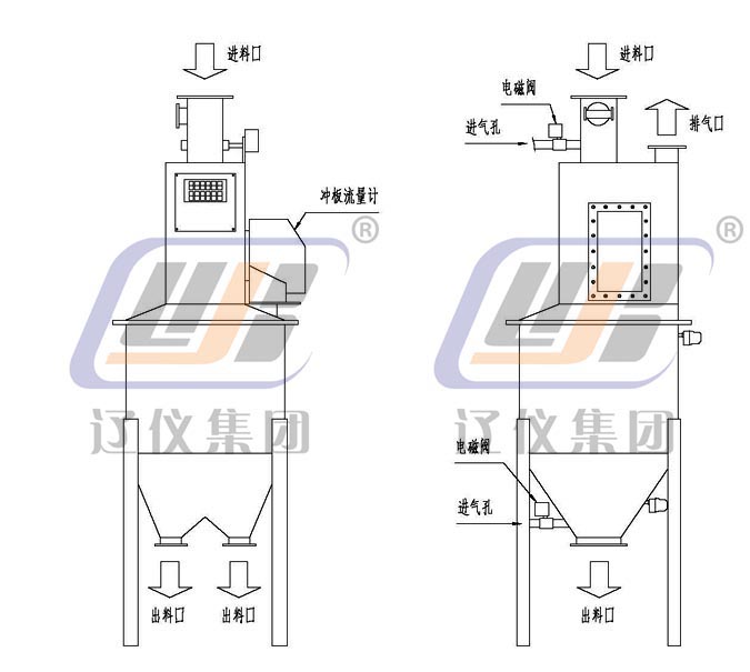载氟氧化铝经风动溜槽进入本系统。先进入除渣装置。物料在此除渣。可通过视窗观察除渣情况,料渣由排渣口排除。排渣后的料经给料机给料,通过冲板流量计进行计量进入集料箱,流量积算仪显示瞬时流量、累计流量。流量大小可根据实际生产需要通过流量调节器设定,给料器自动调节,也可定量控制。当集料箱无料时,料位开关控制给料器自动开启。料堆积到上料位计时,料位开关控制给料器关闭,由于载氟氧化铝供料过程是间歇给料,为防止物料沉积,在本系统进、出料口设有气动松动装置,保证物料顺利进出。气体由排气口引出。
