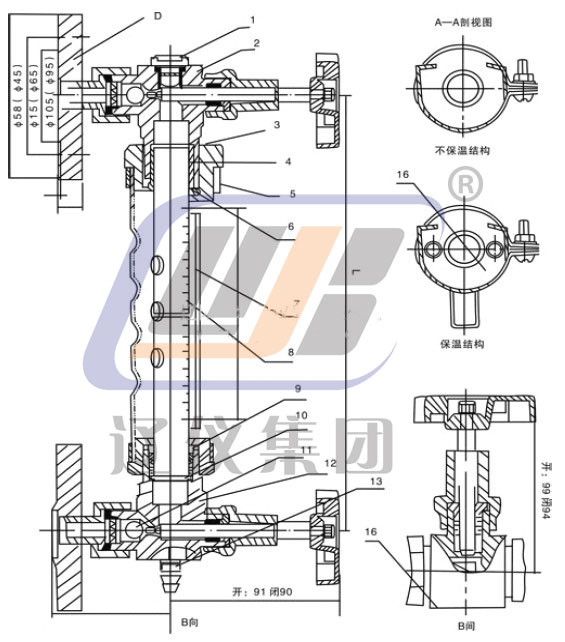 9.压盖螺母 10.底环‖ 11.钢球 12.下阀 13.排污接头 14.保温管 15.平焊法兰 16.标牌